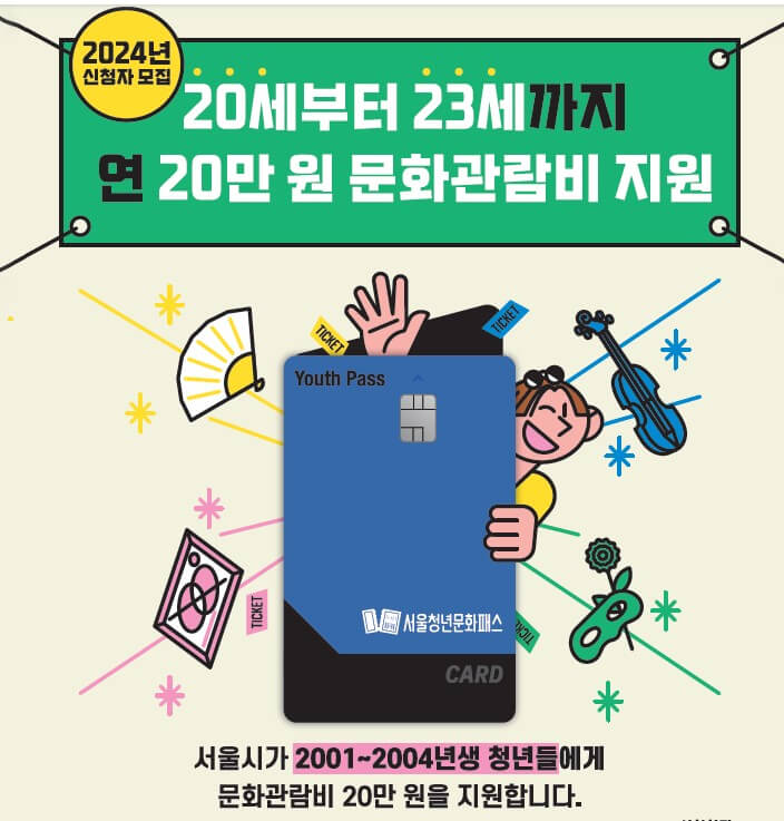- 서울청년문화패스는 공연예술분야의 관람 지원비 1인당 연간 20만 원을 문화이용권 카드로 지급됩니다.