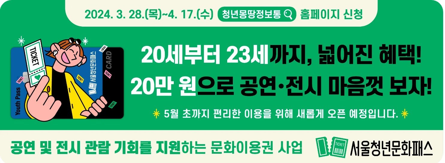 서울청년문화패스란 20세~23세의 사회에 첫 발을 내딛는 청년들에게 뮤지컬, 연극, 오페라, 클래식, 무용, 발레, 국악 등의 전시 관람을 할 수 있게 기회를 제공하여 청년들이 문화예술분야에 활발히 즐길 수 있기를 지원하는 것입니다. 청년들께서는 이 좋은 혜택을 그냥 지나치시면 안 되겠죠? 빠르게 신청해서 연인과 또는 친구들이 함께 즐겨 보세요.